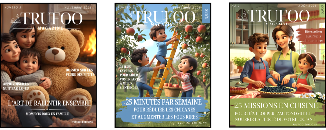 Dans chaque numéro du magazine TRUFOO, des missions thématiques, des activités pour les enfants clés en main, des astuces sur le développement socio-émotionnels et des jeux éducatifs pour nourrir la confiance, l’autonomie et le plaisir d’être ensemble.